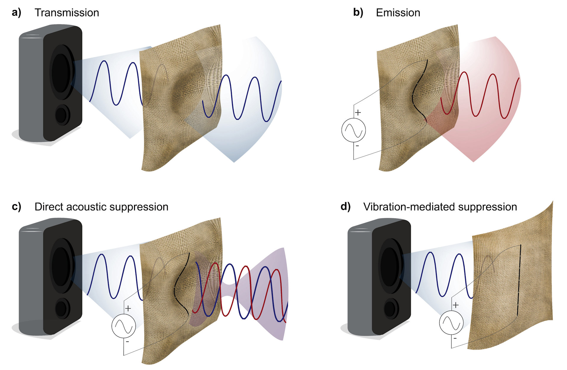 Die mit A-D beschrifteten Bilder zeigen ein schwingendes Gewebe: A ist mit „Transmission“ beschriftet und zeigt eine blaue Schallwelle, die durch ein Gewebe läuft. B ist mit „Emission“ beschriftet und zeigt eine rote Schallwelle, die aus dem Gewebe austritt. C ist mit „Direkte akustische Unterdrückung“ beschriftet, und die roten und blauen Wellen sehen gespiegelt aus. D ist mit „vibrationsvermittelte Unterdrückung“ beschriftet und zeigt, dass kein Lärm durch den Stoff dringt. (Quelle: Forschungsteam/MIT)