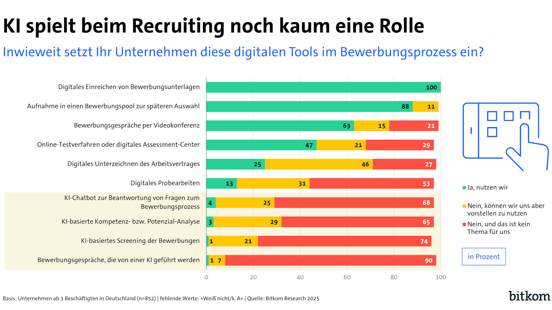 Bewerbungsunterlagen per Mail oder über ein Online-Portal erhalten, das ist in deutschen Unternehmen Standard. Im weiteren Bewerbungsverlauf werden aber noch deutlich weniger digitale Tools eingesetzt – und Künstliche Intelligenz kommt in Deutschland beim Recruiting noch kaum zum Einsatz. So haben nur 4 Prozent der Unternehmen einen KI-Chatbot, der Fragen im Bewerbungsprozess beantwortet, 25 Prozent können sich aber vorstellen, künftig einen solchen zu nutzen. 3 Prozent setzen auf eine KI-basierte Kompetenz- bzw. Potenzial-Analyse von Bewerberinnen und Bewerbern (29 Prozent können sich den Einsatz vorstellen), gerade einmal je 1 Prozent geben an, Bewerbungen mit KI-Hilfe zu screenen (21 Prozent können sich das vorstellen) oder Bewerbungsgespräche von einer KI führen zu lassen (7 Prozent halten das künftig für möglich). Das sind Ergebnisse einer Befragung von 852 Unternehmen ab 3 Beschäftigten in Deutschland im Auftrag des Digitalverbands Bitkom. „KI wird in Deutschland im Bewerbungsprozess noch sehr selten eingesetzt. Als Unterstützung für die Personalverantwortlichen kann sie aber sowohl dabei helfen, fundiertere Entscheidungen zu treffen, als auch Interessierten schnell und niedrigschwellig Fragen zum Bewerbungsprozess oder zur Stelle zu beantworten“, sagt Adél Holdampf-Wendel, Bereichsleiterin Future of Work beim Digitalverband Bitkom.