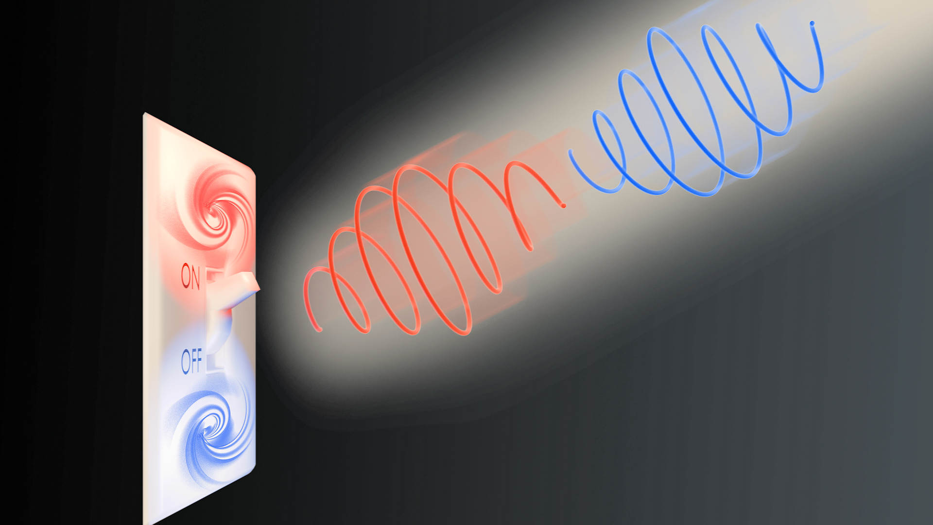 Terahertz Licht kann eine ungewöhnliche Form struktureller Ordnung in Festkörpern – die sogenannte Ferroaxialität – umkehrbar zwischen rechts- und linksgedrehten Rotationsmustern schalten. (Quelle: Jörg Harms/MPSD)