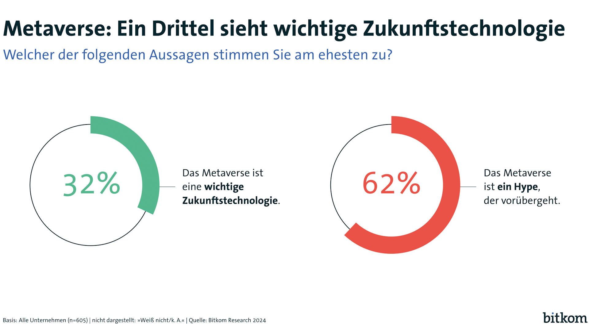 Das sind Ergebnisse einer repräsentativen Befragung von 605 Unternehmen ab 20 Beschäftigten in Deutschland im Auftrag des Digitalverbands Bitkom. „Auch wenn sich der Anteil jener Unternehmen, die sich bereits mit dem Metaverse beschäftigt haben, in den letzten beiden Jahren von 6 auf 13 Prozent mehr als verdoppelt hat: Das Metaverse wird weiterhin massiv unterschätzt“, sagt Bitkom-Hauptgeschäftsführer Dr. Bernhard Rohleder. „Wer das Metaverse für eine wichtige Zukunftstechnologie hält, sollte sich mit den Möglichkeiten für das eigene Unternehmen ernsthaft auseinandersetzen.“