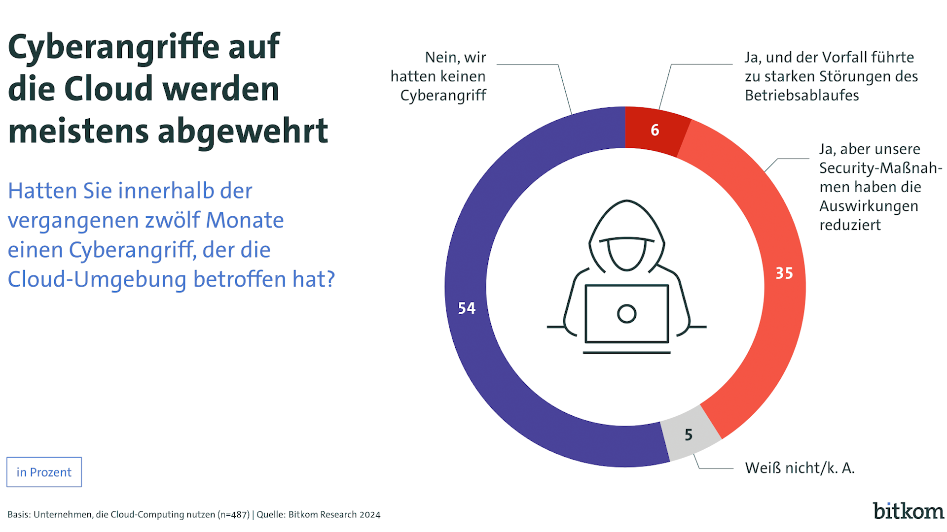 Phishing-Mails, um Passwörter zu stehlen, DDoS-Angriffe, um die IT lahmzulegen oder Ransomware-Attacken, mit denen Schadsoftware eingeschleust und Daten verschlüsselt sowie Lösegeld erpresst werden sollen – das ist Alltag für viele Unternehmen. Cloud-Dienste bieten dabei Schutz gegen viele dieser Cyberangriffe. Von jenen 81 Prozent der Unternehmen, die aktuell Cloud Computing nutzen, geben mehr als die Hälfte (54 Prozent) an, dass bei ihnen in den vergangenen zwölf Monaten keine Cyberangriffe auf die Cloud-Umgebung stattgefunden haben. Bei weiteren 35 Prozent hat es zwar Angriffe gegeben, die Security-Maßnahmen haben aber gegriffen und die Auswirkungen reduziert. Nur bei 6 Prozent kam es zu starken Störungen des Betriebsablaufs durch die Angriffe. Das sind Ergebnisse einer repräsentativen Befragung von 603 Unternehmen ab 20 Beschäftigten aus allen Wirtschaftsbereichen in Deutschland im Auftrag des Digitalverbands Bitkom. „Cloud-Anbieter beschäftigen hochspezialisierte Expertinnen und Experten, um ihre Dienste zu schützen und immer auf dem neuesten Stand der technologischen Entwicklung zu halten. Das können viele IT-Abteilungen vor allem in kleineren und mittelständischen Unternehmen nicht leisten“, sagt Lukas Klingholz, Cloud-Experte beim Bitkom. „Die Cloud bietet jedem Unternehmen die Chance, seine IT-Sicherheit auf Top-Niveau zu bringen.“