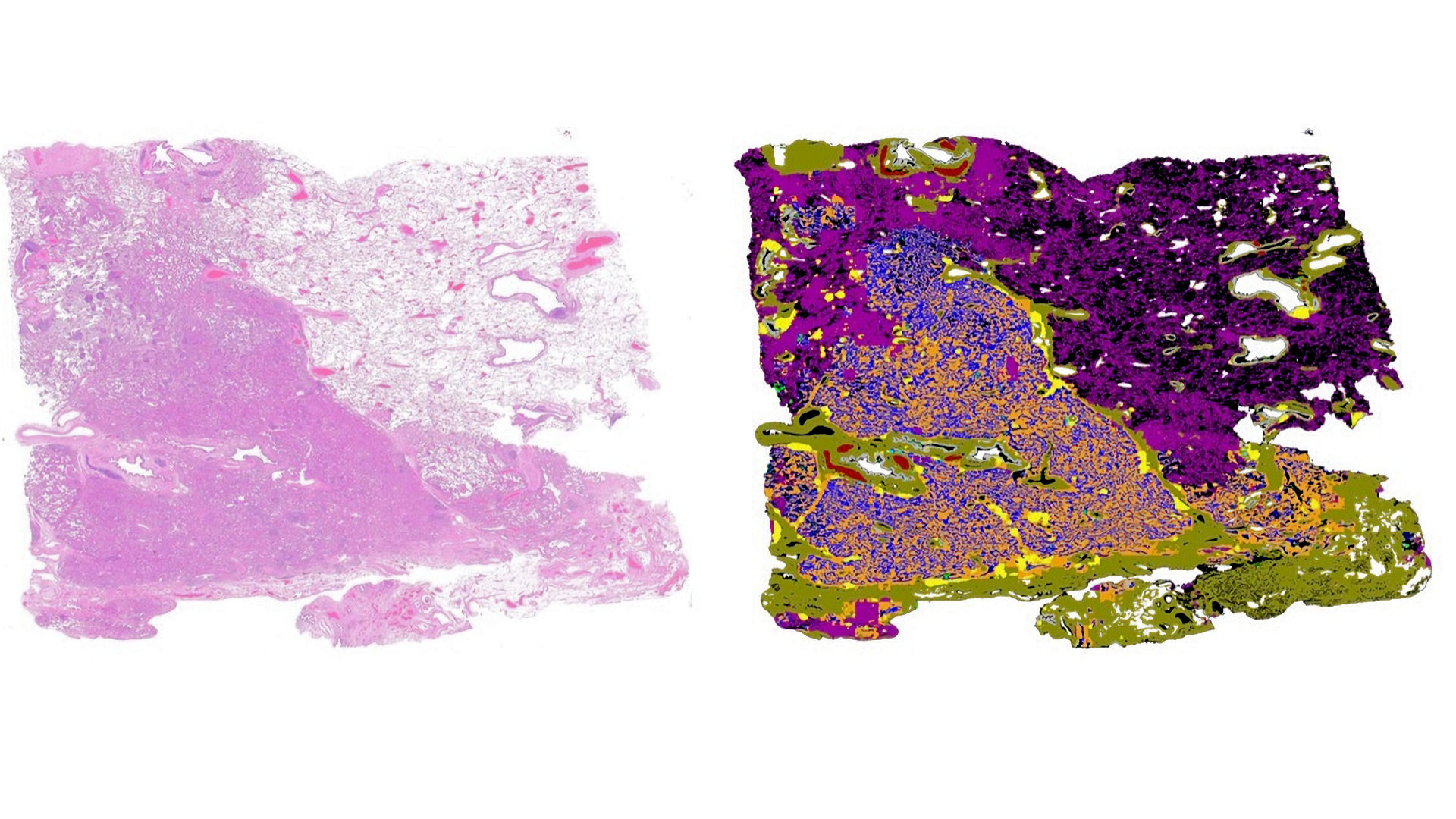 Das Bild zeigt, wie der Algorithmus initiale Aufarbeitung des typisch gefärbten Gewebsschnittes (links) macht und eine Karte erstellt, in der verschiedene Gewebsstypen in unterschiedlichen Farben zu sehen sind (Blau ist der Tumor/Adenokarzinom der Lunge). (Quelle: Dr. Yuri Tolkach)