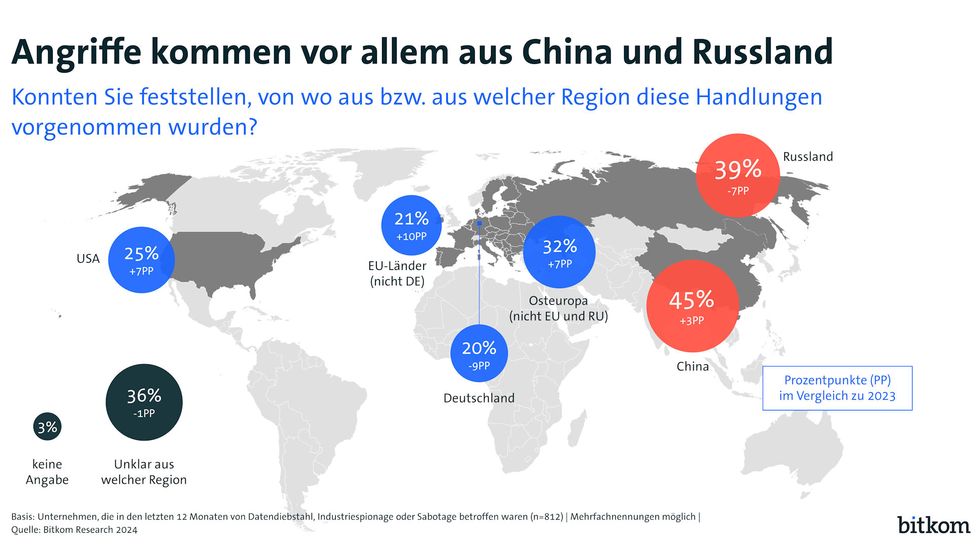 Angriffe kommen vor allem aus China und Russland. (Quelle: Bitkom)