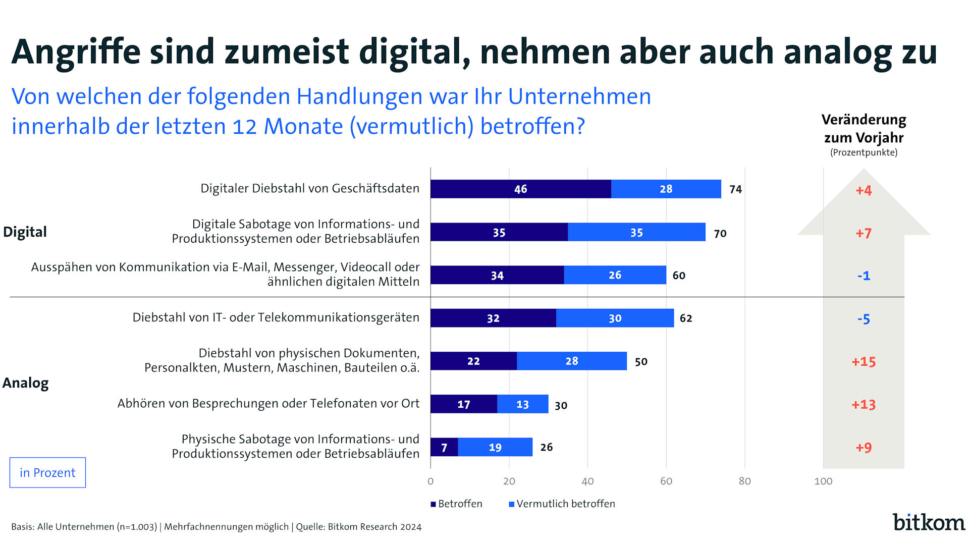 Angriffe sind zumeist digital, nehmen aber auch analog zu. (Quelle. Bitkom