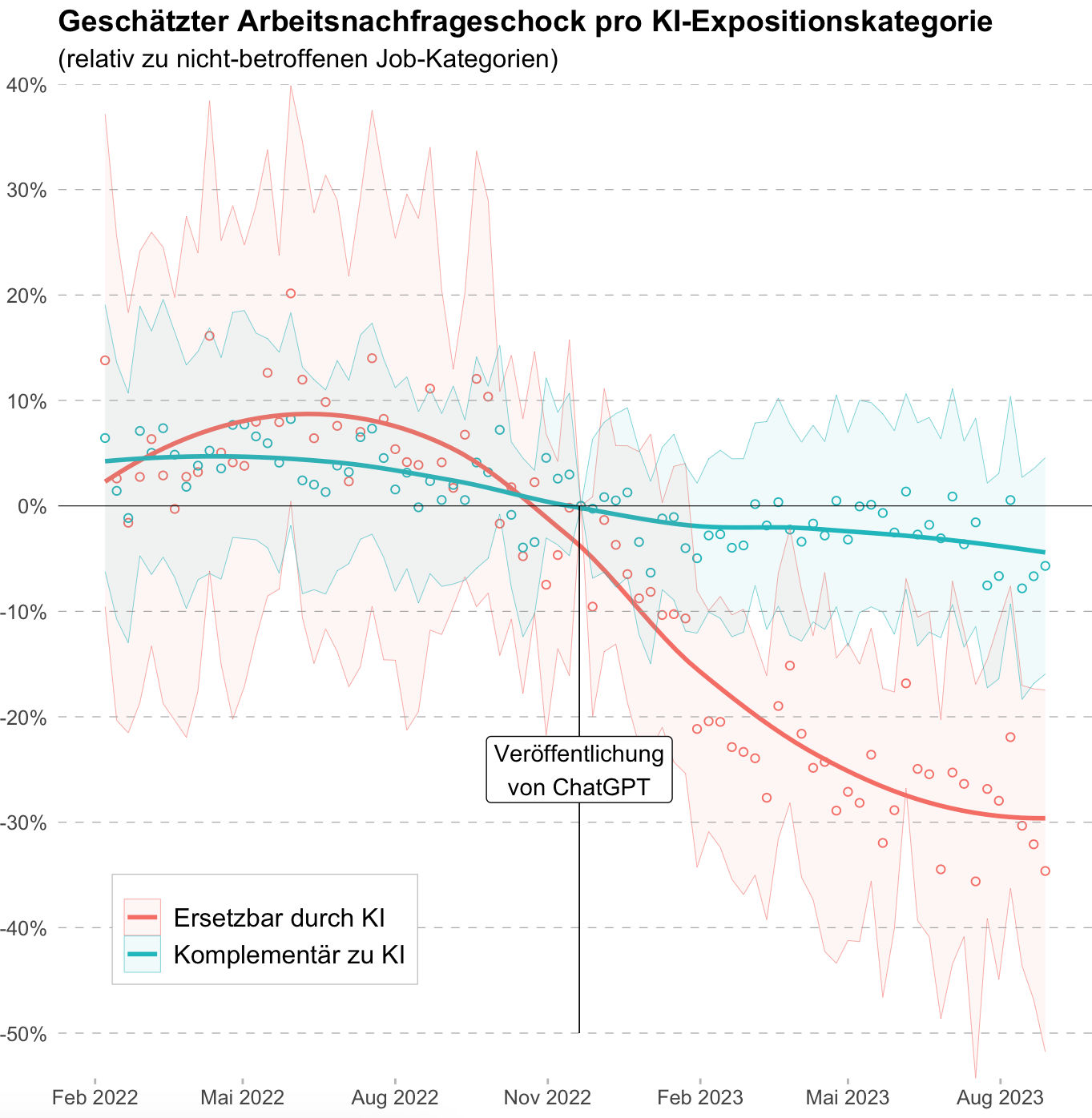 Nachfragerückgang in einigen Bereichen: In einigen Arbeitsbereichen (z. B. bei stark repetitiven Schreibaufgaben) führt ChatGPT zu einem effektiven Rückgang der Arbeitsnachfrage im Vergleich zum allgemeinen Arbeitsmarkttrend. Bei Tätigkeiten, die teilweise substituierbare Fähigkeiten erfordern, wie z. B. Schreiben und Übersetzen, ist die Nachfrage um 20 bis 50 Prozent gesunken, da diese Aufgaben von Tools übernommen werden.