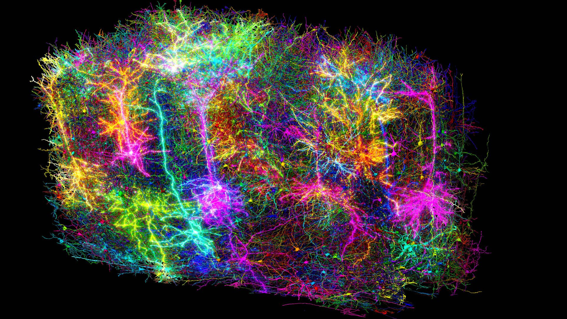Das Bild zeigt mehr als 1.000 der 120.000 Gehirnzellen (Neuronen + Glia), die im Rahmen des MICRONS-Projekts rekonstruiert wurden. (Quelle: The MICrONS Project)