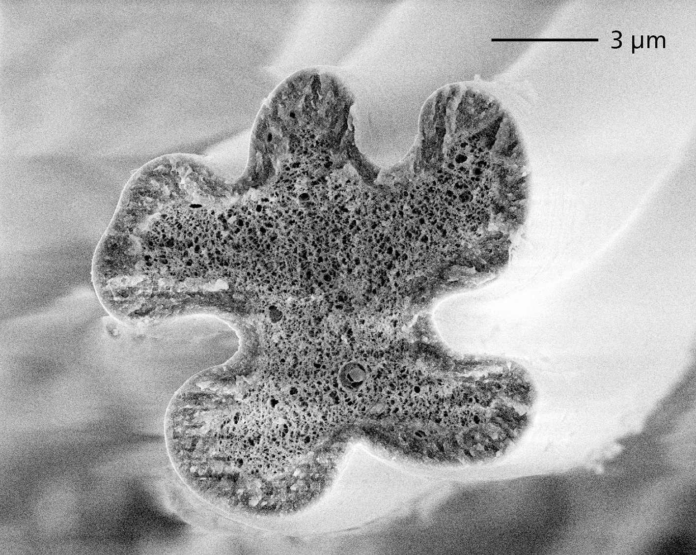 Frisch gesponnene Cellulosefaser mit gelapptem (lobuliertem) Querschnitt unter dem Rasterelektronenmikroskop (Kryo-Transfer REM). Die poröse Struktur verdichtet sich beim Trocknen der Faser, die Form bleibt bei der Carbonisierung erhalten. (Quelle: Fraunhofer IAP)