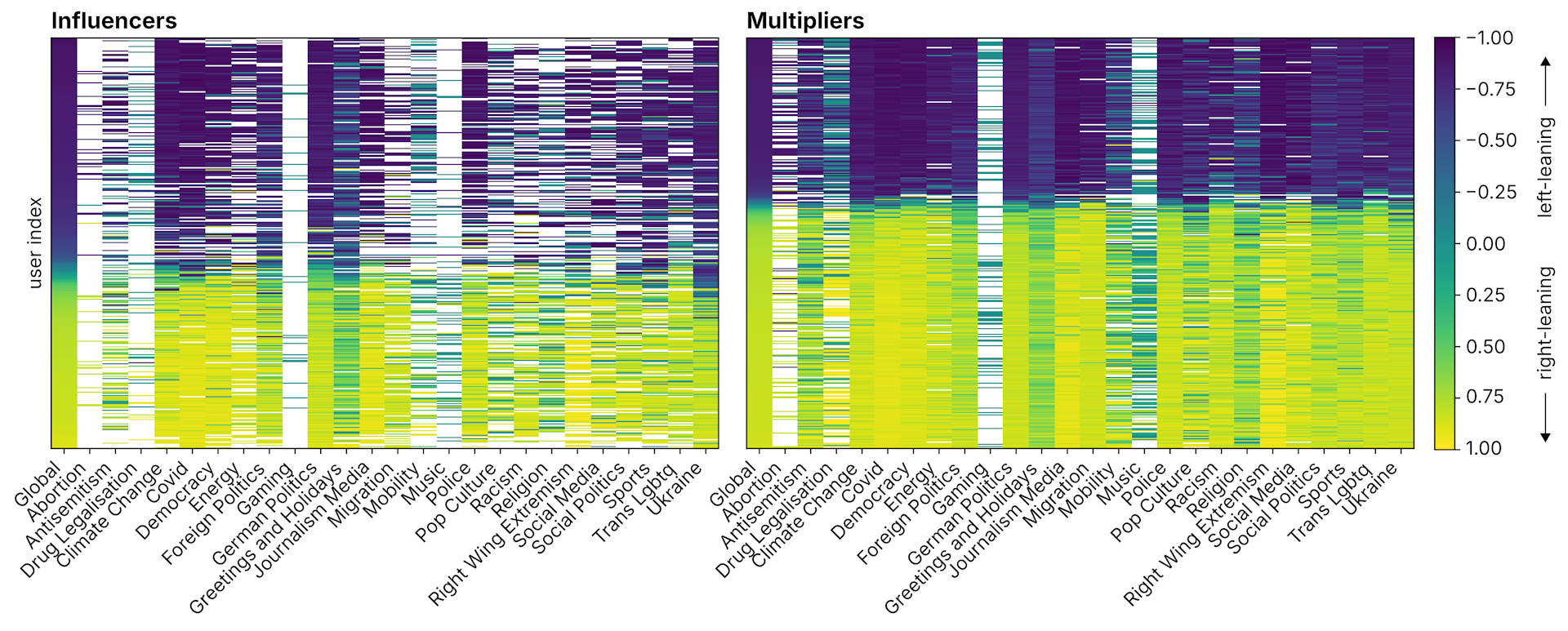 Die Polarisierung beschränkt sich nicht auf einige wenige „heiße Eisen“, sondern erstreckt sich gleichzeitig über mehrere politische Bereiche. Die Analyse der 1.000 einflussreichsten Influencer und Multiplier zeigt, dass Multiplier aktiver sind und über verschiedene Themen hinweg eine stärkere ideologische Ausrichtung aufrechterhalten als Influencer. Während die meisten politischen Themen stark ausgerichtet sind, ziehen nicht- politische Themen wie Gaming und Musik durchaus sehr unterschiedliche Nutzergruppen an und bleiben nur schwach polarisiert. Ein ähnlicher Effekt der Neuorientierung zeigte sich bei Diskussionen zum Thema Ukraine, wo einige rechtsgerichtete Influencer sich von der vorherrschenden pro- russischen Haltung ihres Clusters distanzierten – ein Muster, das bei Multiplier wiederum weniger sichtbar war. Über alle Themen hinweg zeigen Multiplier durchgehend eine stärkere themenübergreifende Ausrichtung als Influencer. Die sogenannte Themen-Ausrichtungsmatrix verdeutlicht eine hohe Ausrichtung über die meisten Themen hinweg – mit Ausnahme von Musik und Gaming. Dabei zeichnen sich graduelle Unterschiede ab: Stark ausgerichtete Themen wie Covid, Journalismus und deutsche Politik stehen weniger stark ausgerichteten Themen wie Sozialpolitik gegenüber.