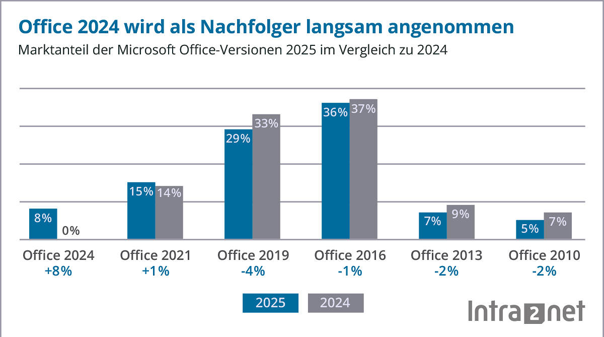 A, 14.10.2025 endet der Support für Microsoft Office 2016 und 2019. Damit erhalten 77 % der kleinen Unternehmen in Deutschland ab sofort keine Sicherheitsupdates mehr für ihr Office-Paket – denn die Migration zu aktuellen Versionen erfolgt nach wie vor nur zögerlich. Dies ist eines der zentralen Ergebnisse der diesjährigen KMU-Studie von Intra2net. Der Groupware- und Security-Anbieter hat dafür die Daten von über 1.500 PC-Arbeitsplätzen in kleinen Unternehmen ausgewertet und mit den Zahlen früherer Studien verglichen.