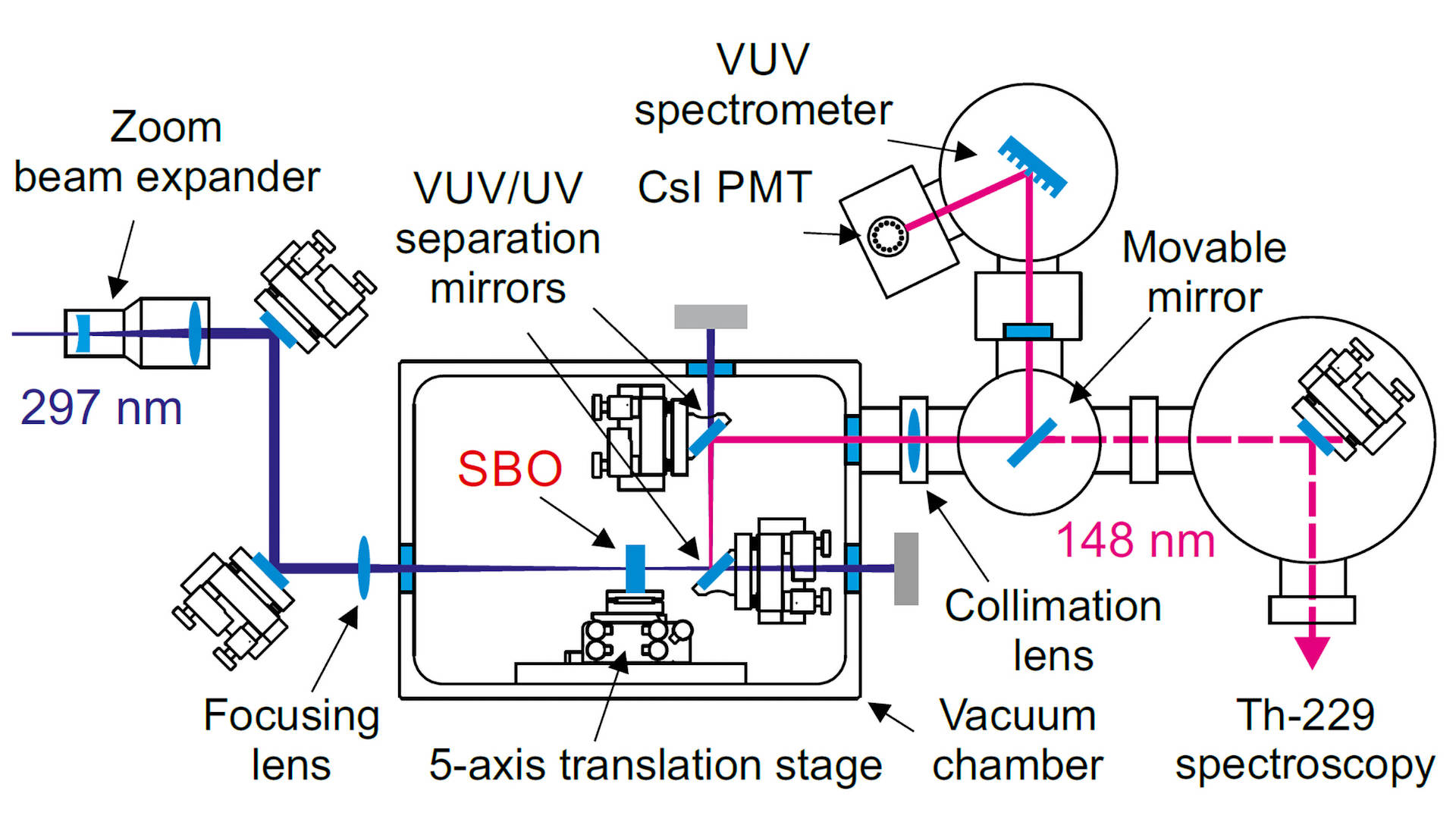 „Die ersten beiden Schritte beruhen auf Standardtechnik“, erklärt Peik. Aber Schritt drei war noch niemals vorher realisiert worden und erforderte eine Art detektivische Suche. Das passende Material fand sich im Max-Born- Institut für Nichtlineare Optik und Kurzzeitspektroskopie (MBI) in Berlin. Valentin Petrov und sein Team haben dort das seltene optische Material Strontiumtetraborat (SBO) erforscht. „Die Nutzung dieses Materials in einem kontinuierlichen VUV-Lasersystem stellt eine weltweite Premiere dar“, sagt Peik. Bis jetzt liefert das System nur eine geringe Ausgangsleistung von 1,3 nW, die jedoch ausreichend sein sollte, um damit eine Laseranregung des Thorium-229-Kerns nachzuweisen. Dies wird aktuell in einem Experiment zusammen mit der Technischen Universität Wien versucht.