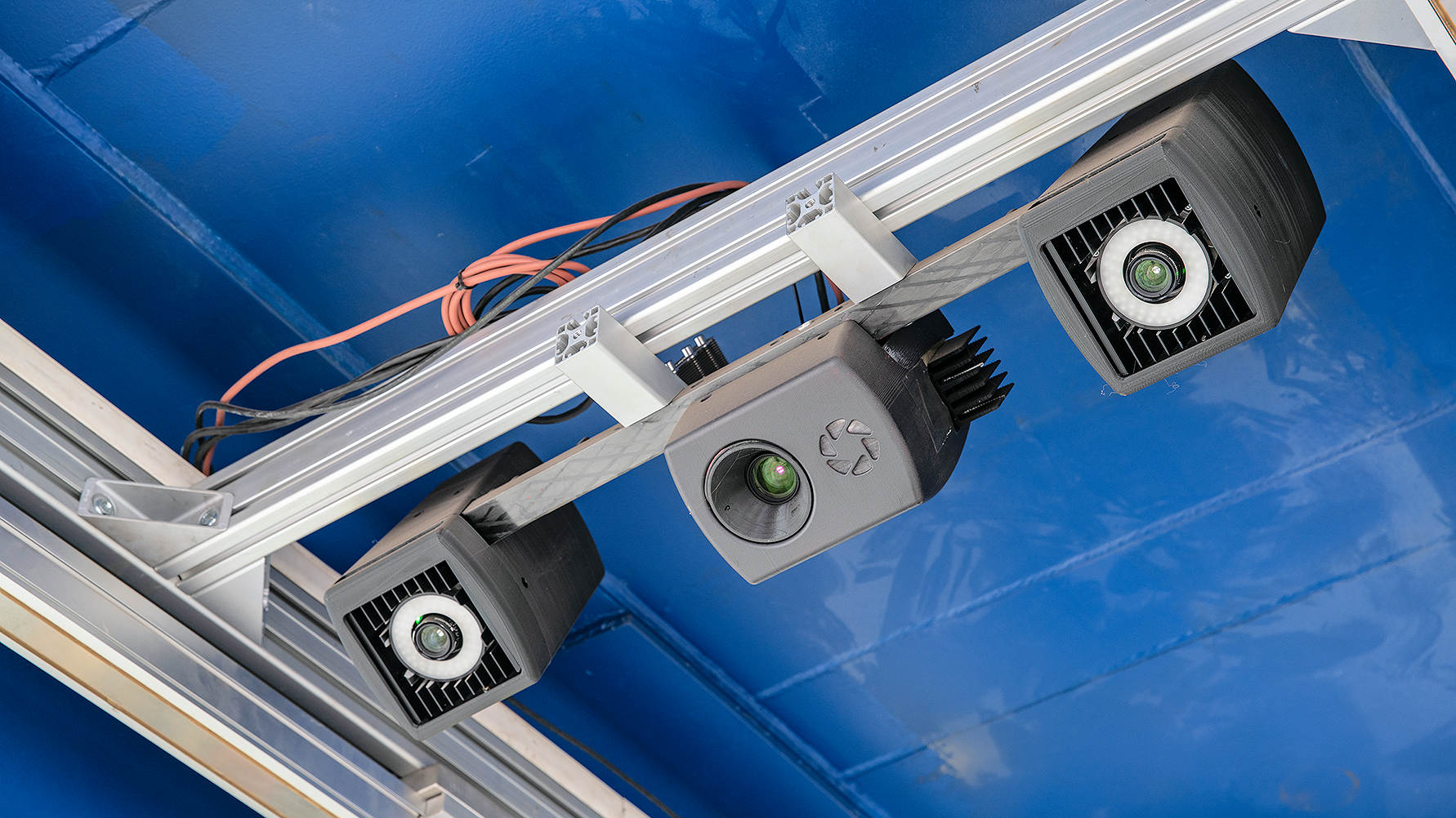 Das Sensornetzwerk besteht aus zueinander synchronisierten Kameras und je einem Projektor zur Musterprojektion für die digitale 3D-Erfassung. (Quelle: Fraunhofer IOF)