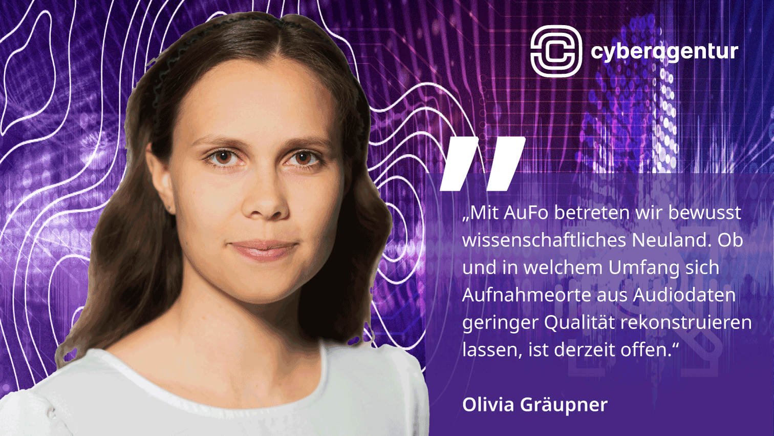 Dieser soll auch zeitliche Verläufe abbilden und perspektivisch ein Geotagging spezifischer Standorte ermöglichen. Grundlage bildet eine Audio-Forensik-Datenbank aus Aufnahmen realer Situationen an vielen verschiedenen Orten, von Messengern und Social-Media-Diensten. Untersucht wird ein hybrider Ansatz aus klassischer Signalverarbeitung und ML-basierten Strategien, ergänzt um Simulationswerkzeuge zur auditiven und automatisierten Ergebnisüberprüfung. Zuverlässigkeits- und Vertrauensmaße sowie die Möglichkeit manueller Eingriffe sind integraler Bestandteil, um den Anforderungen realer forensischer Praxis gerecht zu werden. „Mit AuFo betreten wir bewusst wissenschaftliches Neuland. Ob und in welchem Umfang sich Aufnahmeorte aus Audiodaten geringer Qualität rekonstruieren lassen, ist derzeit offen. Genau darin liegt aber das disruptive Potenzial dieses Programms“, betont Olivia Gräupner, Projektleiterin und Forschungsreferentin in der Abteilung Sichere Gesellschaft der Cyberagentur. „Die beiden Projekte verfolgen unterschiedliche methodische Ansätze und adressieren damit zentrale Risiken und Chancen zugleich. Unser Ziel ist es, belastbare Grundlagen zu schaffen, die Ermittlungsbehörden in hochsensiblen Lagen schneller handlungsfähig machen können – auch wenn der Erfolg heute noch nicht garantiert ist.“