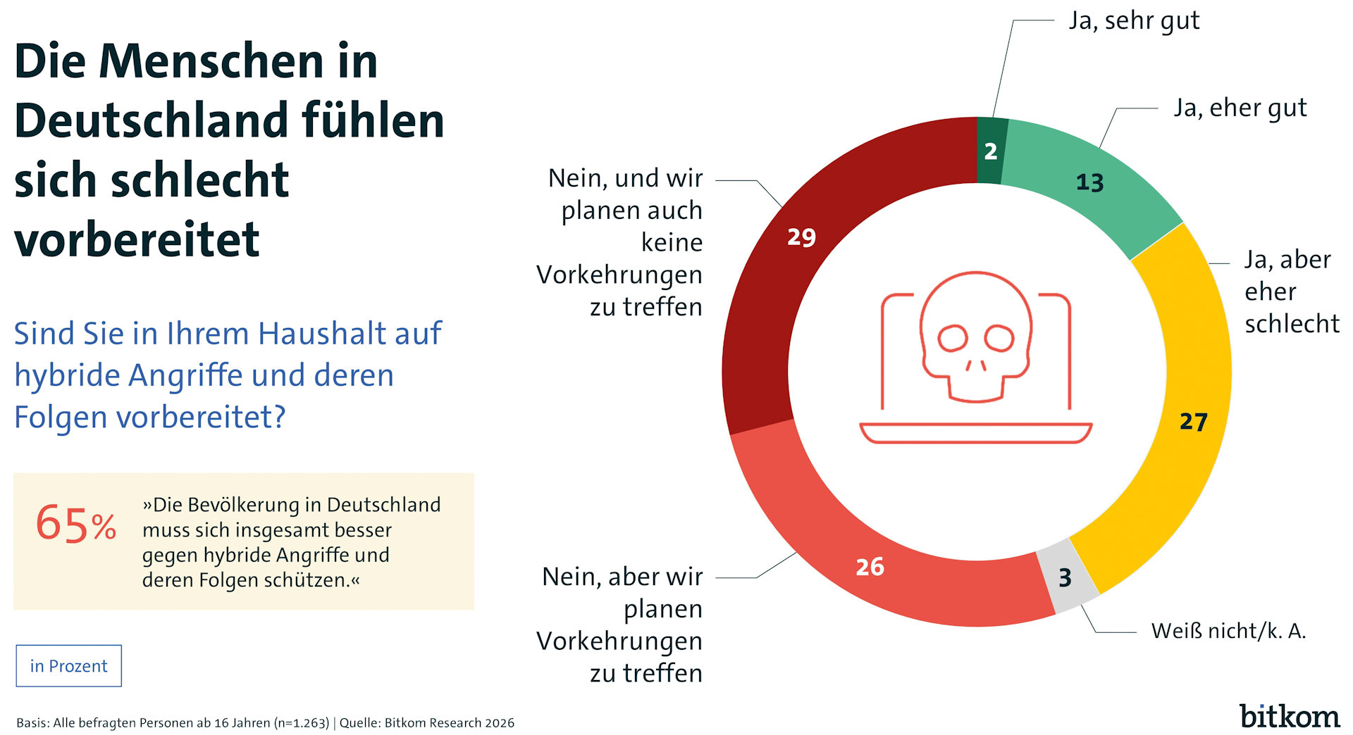 Ob IT-Störung bei der Bahn durch Cyberangriffe oder Stromausfall nach der Sabotage von Leitungen: Die große Mehrheit der Deutschen rechnet mit ernstzunehmenden Krisen infolge digitaler Attacken, Sabotageaktionen und Desinformationskampagnen. Auf der anderen Seite bereitet sich kaum jemand auf die Folgen solcher hybrider Angriffe vor. Nur 2 Prozent der Bevölkerung halten ihren Haushalt für sehr gut auf hybride Angriffe und ihre Folgen vorbereitet, weitere 13 Prozent für eher gut. Rund ein Viertel (27 Prozent) sieht sich eher schlecht vorbereitet und mehr als die Hälfte (55 Prozent) ist nach eigenen Angaben überhaupt nicht vorbereitet. Dabei planen immerhin 26 Prozent, Vorkehrungen zu treffen, 29 Prozent wollen dies aber auch künftig nicht tun.