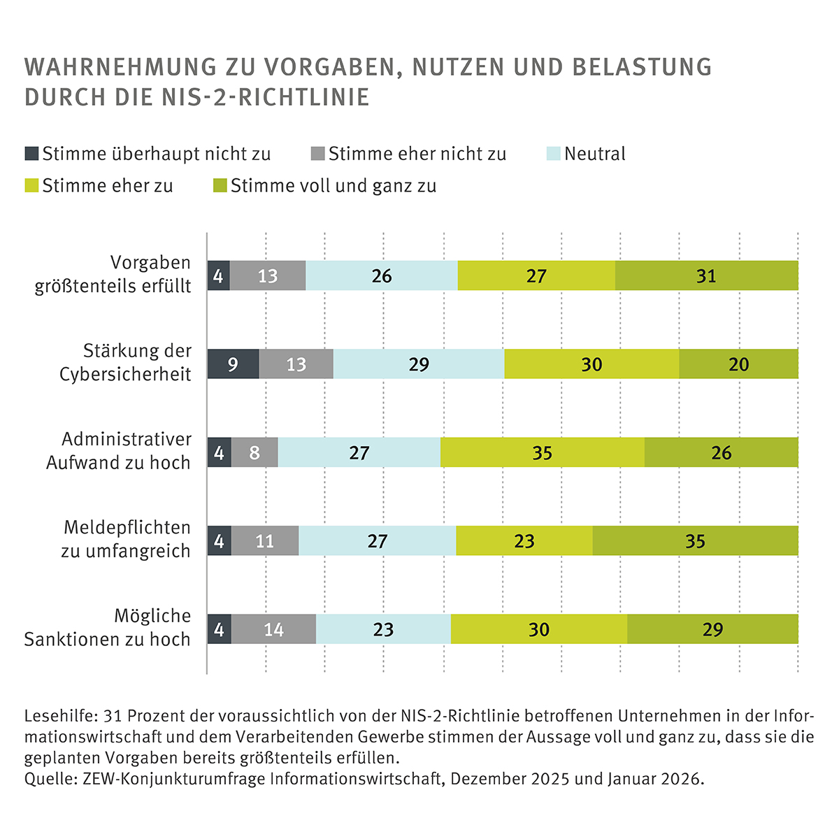 Die Daten vom Dezember 2025 und Januar 2026 wurden im Rahmen des ZEW- Branchenreports Informationswirtschaft erhoben. Dafür haben die Forschenden rund 1.100 Unternehmen in Deutschland befragt. Sie stammen aus dem Verarbeitenden Gewerbe und der Informationswirtschaft, die sich aus IKT-Branche, Mediendienstleistern und wissensintensiven Dienstleistern zusammensetzt. Unter den befragten Unternehmen gaben rund 200 Unternehmen an, voraussichtlich von der NIS-2-Richtlinie betroffen zu sein.