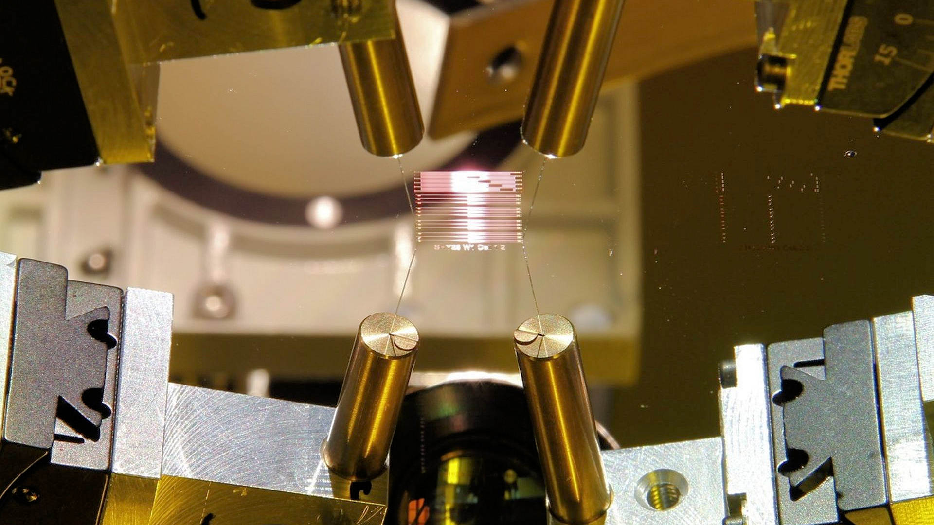 Beispielhafter integrierter photonischer Chip in Labor-Messaufbau mit Faserkopplung. (Quelle: AMO GmbH)
