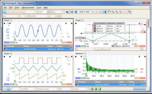 Interessanterweise ließen beide Messgeräte parallel an meinem Windows 8.1 Laptop betrieben ohne sich zu beeinflussen. Beim Programmstart wählt man das Gerät aus und schon kann man messen oder die eingebauten Funktionsgeneratoren einsetzen. Diese Messinterfaces sind eine interessante Lösung. Die konventionellen Oszilloskope mit eingebautem Bildschirm wenden sie allerdings nicht verdrängen. Aber immer da, wo sowieso ein Rechner involviert ist, liegen die Messwerte direkt im Rechner vor. Mit dem mitgelieferten Programmierinterface können Messreihen direkt durch eigene Algorithmen optimiert werden.