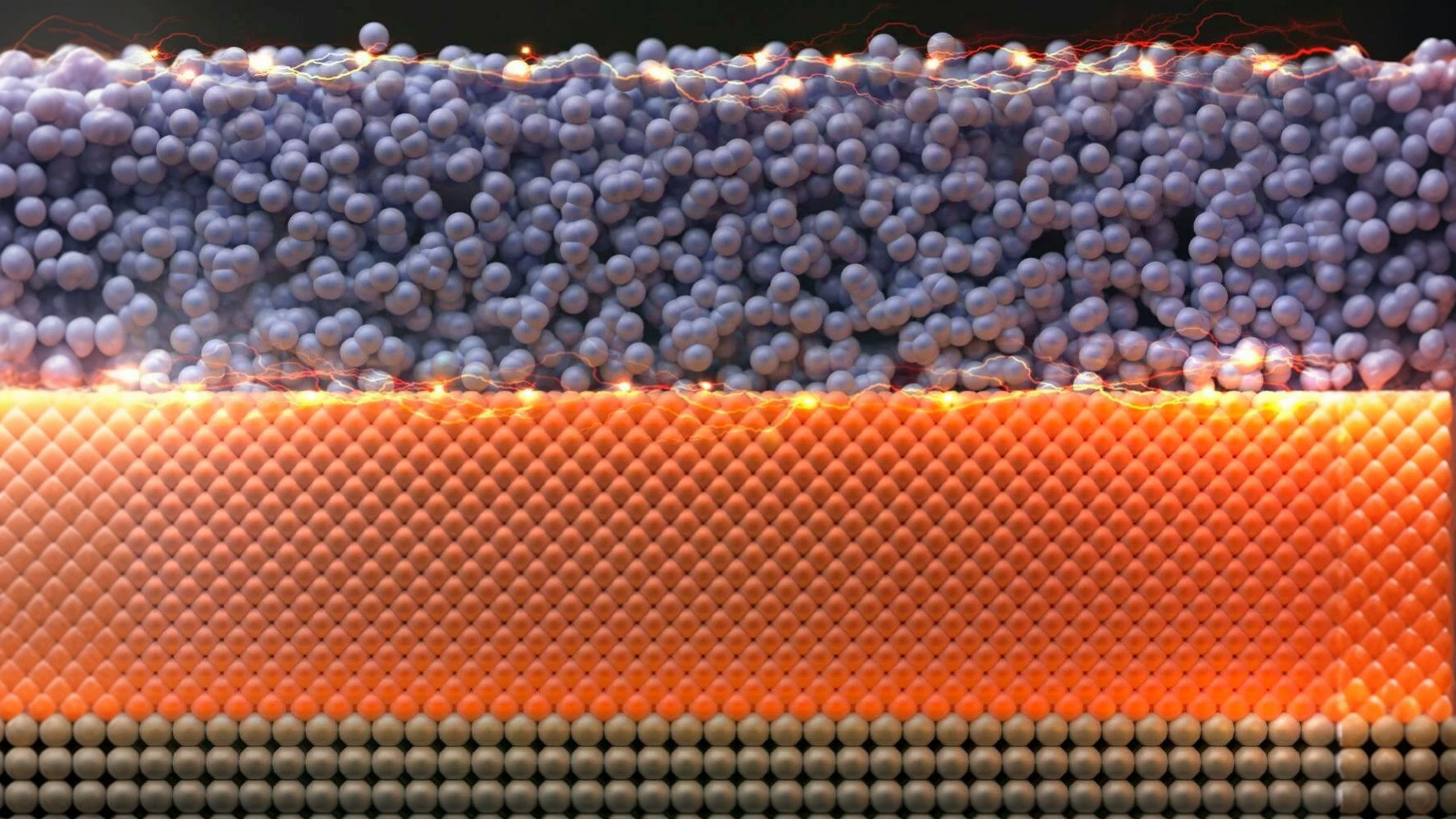 Querschnitt von leitfähigen atomaren Schichten. Ein wenige Atome dicker Film aus nichtkristallinem Niobphosphid leitet durch die Oberfläche besser, was das Material insgesamt zu einem besseren Leiter macht. (Quelle: Il-Kwon Oh/Asir Khan/stanford.edu)