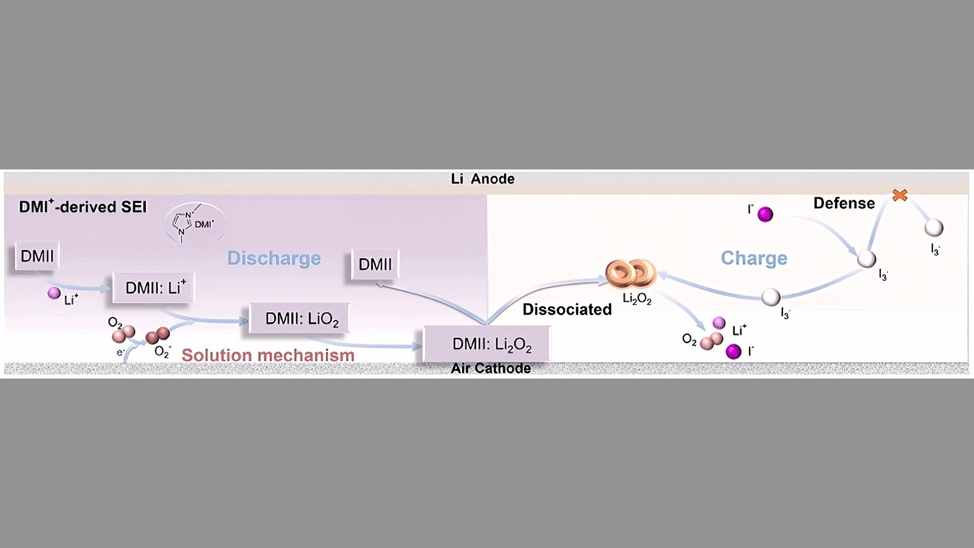 Die Iodid-Ionen I− des Salzes können leicht zu I3− und wieder zurück reagieren (Redox-Paar) und dabei Elektronen auf Sauerstoff übertragen (Entladen) und wieder zurücknehmen (Laden). Dieser erleichterte Ladungstransport beschleunigt die Reaktionen, verringert die Überspannung der Kathode und erhöht die Entladungskapazität der elektrochemischen Zelle. Die DMI+-Ionen des Salzes enthalten einen Fünfring aus drei Kohlenstoff- und zwei Stickstoffatomen mit frei beweglichen Elektronen.
