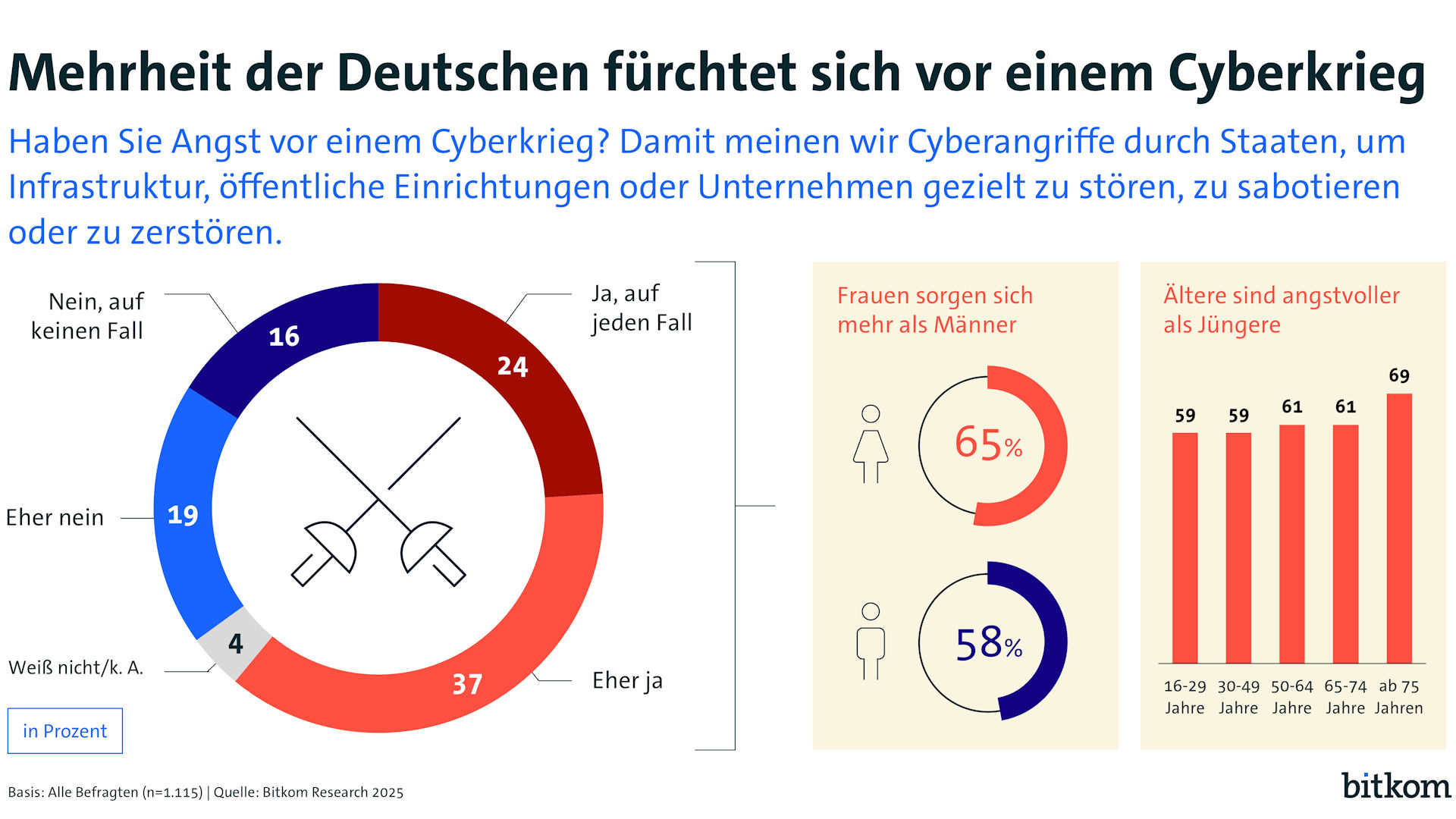Weit verbreitet ist die Angst vor einem Cyberkrieg. 61 Prozent haben aktuell Angst vor einem solchen Szenario. Jüngere (59 Prozent bei den 16- bis 29-Jährigen sowie den 30- bis 49-Jährigen) sind dabei etwas weniger besorgt als die Älteren (69 Prozent bei den ab-75-Jährigen), Frauen haben mit 65 Prozent etwas mehr Sorge als Männer (58 Prozent). Vor allem jenen Staaten, die als Cyberbedrohung gelten, werden gute technische Fähigkeiten für eine solche Auseinandersetzung zugesprochen. Ganz oben stehen Russland (76 Prozent), die USA (75 Prozent) und China (74 Prozent). Nordkorea ist für 52 Prozent gut gerüstet, der Iran für 46 Prozent. Deutschland nennen 61 Prozent, Israel 52 Prozent, Frankreich 46 Prozent, am Ende liegen Großbritannien (42 Prozent) und die Ukraine (41 Prozent). „Europa muss eigene Fähigkeiten für den Fall eines Cyberkriegs aufbauen“, so Wintergerst.