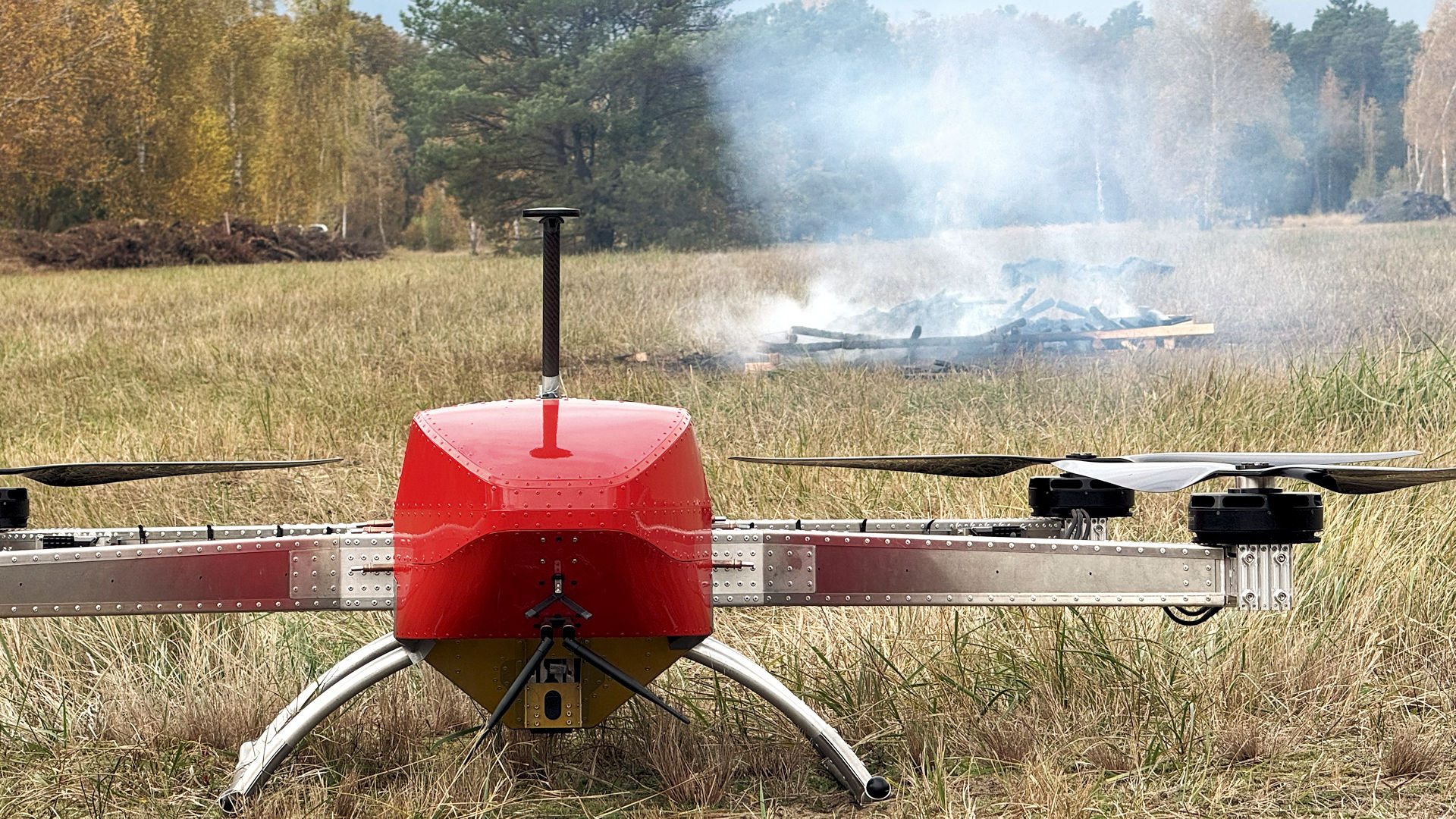 Der Holzstapel ist gelöscht, die Drohne gelandet. Deren Abfluggewicht mit Akku und gefülltem Löschmitteltank liegt bei 65 Kilogramm, diagonal misst sie von Propellerspitze zu Propellerspitze 3,20 Meter. (Quelle. Harald Müller/Uni Magdeburg-Stendal)