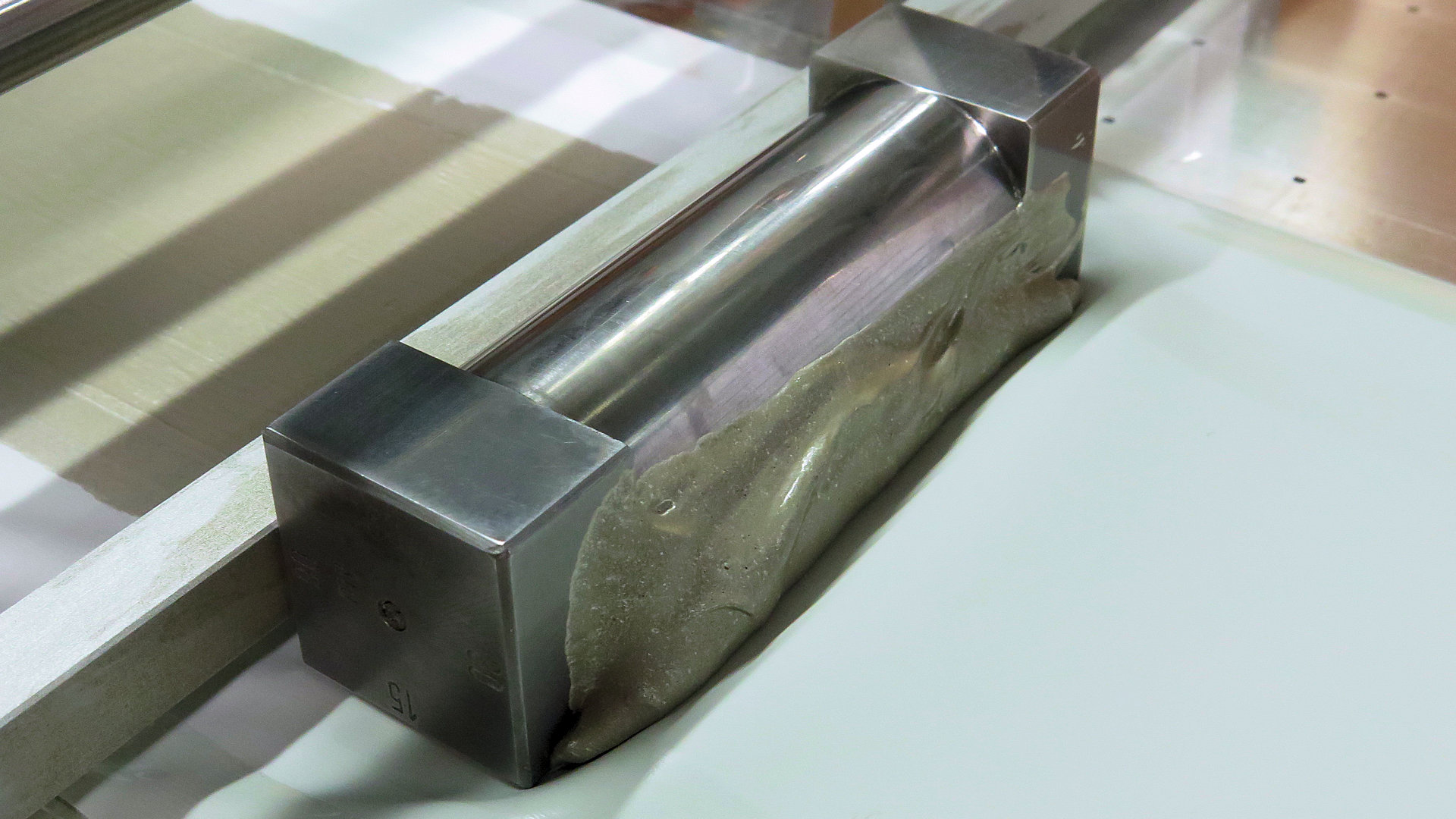 Aufbringen der einer Schicht leitfähiger Druckpaste mit einer Rakel. (Quelle: DITF)