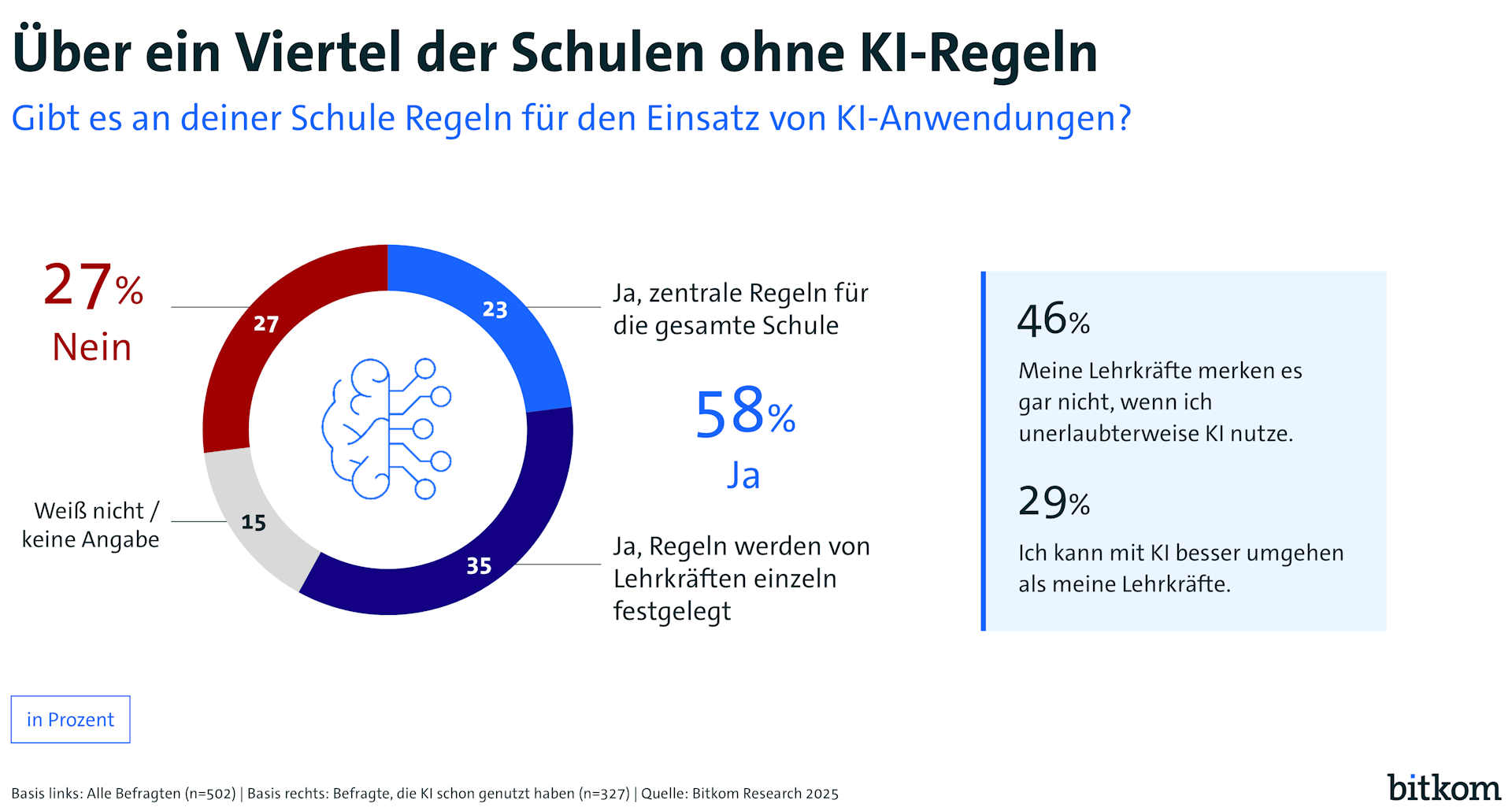 Um schneller einen Aufsatz zu schreiben, die Antwort im Unterricht nachzuschlagen oder Ideen für das Kunstprojekt zu sammeln – Künstliche Intelligenz ist längst auch in vielen deutschen Klassenzimmern angekommen. Allerdings hat nicht einmal jede vierte Schule zentral geregelt, was dabei erlaubt und was verboten ist. Lediglich an 23 Prozent der weiterführenden Schulen gibt es zentrale KI-Regeln, die für die ganze Schule gelten. An weiteren 35 Prozent werden entsprechende Regeln von Lehrkräften einzeln festgelegt. Das sind Ergebnisse einer repräsentativen Befragung unter 502 Schülerinnen und Schülern an weiterführenden Schulen zwischen 14 und 19 Jahren im Auftrag des Digitalverbands Bitkom.