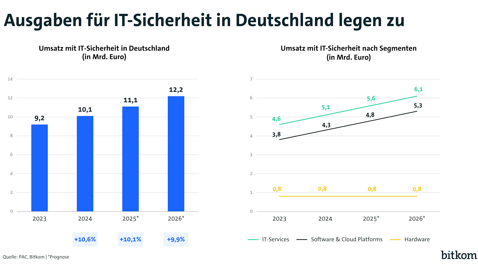 Deutschland rüstet sich gegen Cyberattacken und investiert verstärkt in IT-Sicherheit. Im laufenden Jahr werden die Ausgaben voraussichtlich um 10,1 Prozent auf 11,1 Milliarden Euro zulegen, nachdem 2024 mit 10,1 Milliarden Euro erstmals die 10-Milliarden-Euro-Marke übersprungen wurde. Das teilt der Digitalverband Bitkom auf Grundlage von Daten des europäischen Beratungs- und Analystenhauses PAC zum Auftakt der IT-Sicherheitsmesse it-sa in Nürnberg mit. Auch für 2026 wird mit einem deutlichen Plus um 9,9 Prozent auf dann 12,2 Milliarden Euro gerechnet. „Erfolgreiche Cyberangriffe können Unternehmen lahmlegen, aber auch Behörden oder Infrastruktur wie Bahnstrecken und Flughäfen. Wir müssen unsere Investitionen in IT-Sicherheit weiter hochfahren“, sagt Bitkom-Präsident Dr. Ralf Wintergerst. Nach einer aktuellen Bitkom-Studie entsteht der deutschen Wirtschaft durch Cyberattacken ein jährlicher Schaden von 202,4 Milliarden Euro, 6 von 10 Unternehmen (59 Prozent) fühlen sich durch Cyberangriffe in ihrer Existenz bedroht. Zugleich geben die Unternehmen nun 18 Prozent ihres gesamten IT-Budgets für IT-Sicherheit aus. 2022 waren es gerade einmal 9 Prozent.