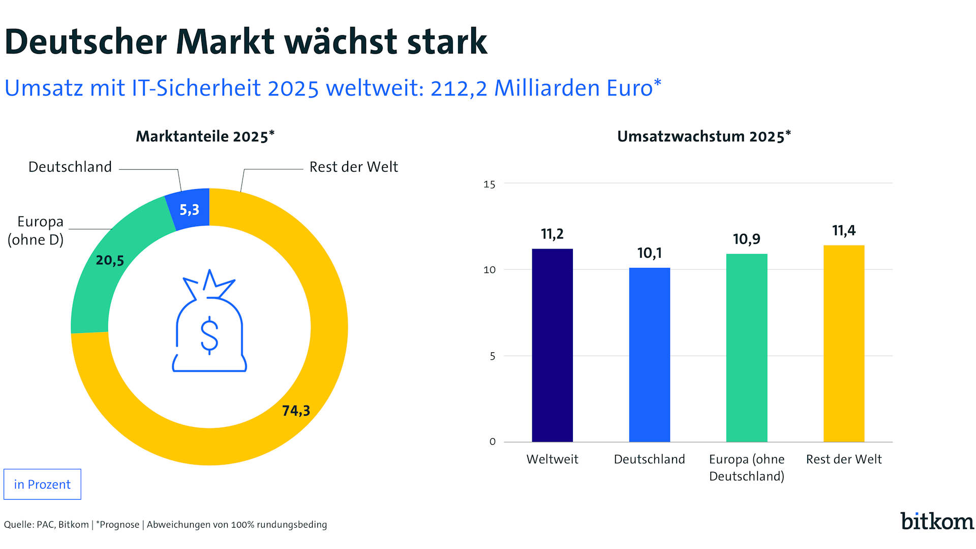 Am stärksten steigen im laufenden Jahr die Ausgaben für Sicherheitssoftware und entsprechende Cloud-Plattformen, die um 12,1 Prozent auf 4,8 Milliarden Euro zulegen. Die Aufwendungen für Dienstleistungen rund um IT-Sicherheit wachsen um 9,7 Prozent auf 5,6 Milliarden Euro. Nur geringfügig um 1,4 Prozent auf 800 Millionen Euro ist das Plus bei IT-Sicherheits-Hardware. Der deutsche Gesamtmarkt für IT-Sicherheit legt 2025 um starke 10,1 Prozent zu, andere Länder wachsen aber schneller. So verzeichnet der weltweite Markt für IT-Sicherheit 2025 ein Wachstum um voraussichtlich 11,2 Prozent auf 212,2 Milliarden Euro. Auch die anderen europäischen Länder steigern ihre Ausgaben durchschnittlich um 10,9 Prozent, der Rest der Welt sogar um 11,4 Prozent. Aktuell beträgt der deutsche Marktanteil am globalen IT-Sicherheitsmarkt 5,3 Prozent. Das restliche Europa kommt auf 20,5 Prozent. „Die große Nachfrage nach gleichermaßen leistungsstarken wie vertrauenswürdigen Sicherheitslösungen bietet enorme Chancen für deutsche Anbieter“, so Wintergerst. „Die it-sa zeigt: Cybersicherheit darf nicht allein als Kostenfaktor verstanden werden, sie garantiert Zukunft und ermöglicht Wertschöpfung, Vertrauen und Innovation in Deutschland.“