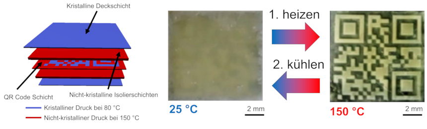 Die Vielseitigkeit der neuen Methode konnte das Team nun in mehreren Beispielen demonstrieren. So wurde etwa im Inneren eines Kunststoffstücks ein QR-Code erzeugt, der von einer kristallinen Schicht verdeckt wird. Diese Schicht ist aber so angepasst, dass sie bei einer bestimmten Temperatur ihre Kristallinität verliert und durchsichtig wird – der geheime QR-Code wird plötzlich sichtbar. Je nach Material und Temperatur kann man auch erreichen, dass der QR-Code für eine gewisse Zeit unlesbar wird, wenn man die falsche Temperatur zum Entschlüsseln verwendet – ganz ähnlich wie man ein Handy für eine gewisse Zeit nicht verwenden kann, wenn man dreimal hintereinander einen falschen Code eingegeben hat.