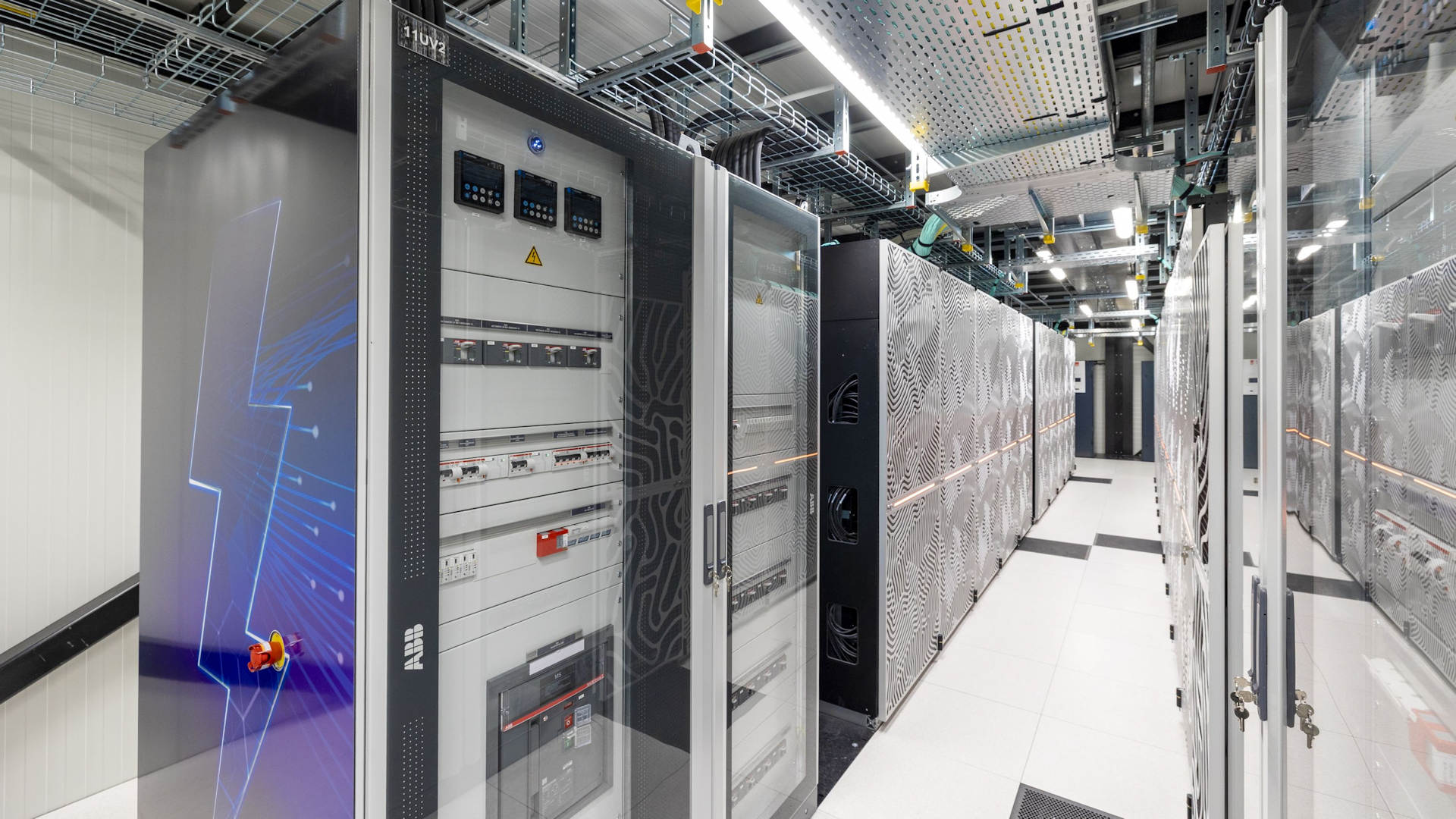 Blick zwischen die Racks des Supercomputers JUPITER auf dem die Simulation eines Quantencomputers mit 50 Qubits gelungen ist. (Quelle: Forschungszentrum Jülich/Sascha Krekla)