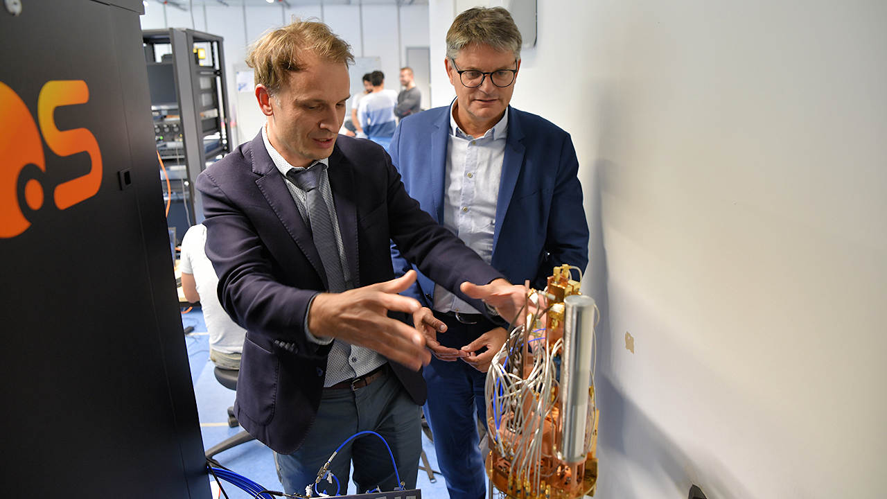 Prof. Dr. Eichler erläutert FAU-Präsident Prof. Dr. Hornegger den Aufbau des Quantenrechners in Eichlers Labor. (Bild: FAU/Boris Mijat)