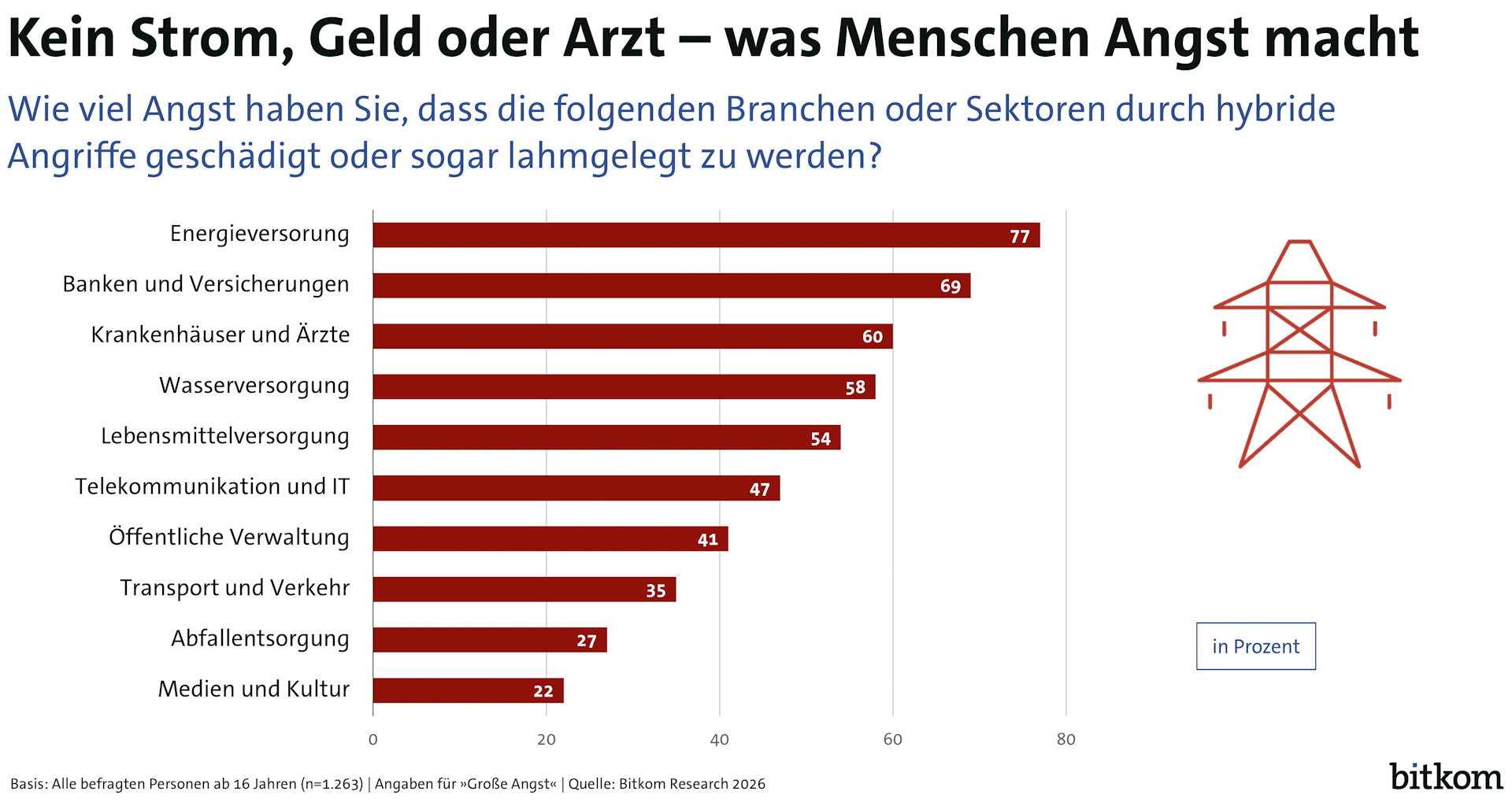 Aktuell sagen 64 Prozent der Menschen in Deutschland, dass sie über Bedrohungen durch hybride Angriffe nicht informiert sind, 65 Prozent finden, die Bevölkerung müsse sich insgesamt besser gegen hybride Angriffe und deren Folgen schützen. Große Angst haben die Menschen vor allem davor, dass Angriffe die Energieversorgung beschädigen oder lahmlegen (77 Prozent), 69 Prozent sorgen sich vor Ausfällen bei Banken und Versicherungen. Dahinter folgen Krankenhäuser und Ärzte (60 Prozent), die Wasserversorgung (58 Prozent) und die Lebensmittelversorgung (54 Prozent). Etwas weniger als die Hälfte (47 Prozent) hat Angst vor Ausfällen bei Telekommunikation und IT, 41 Prozent bei der öffentlichen Verwaltung und 35 Prozent bei Transport und Verkehr. Schlusslichter sind die Abfallentsorgung (27 Prozent) sowie Medien und Kultur (22 Prozent). „Deutschland muss nicht nur seine kritische Infrastruktur noch besser schützen. Jeder und jede Einzelne, aber auch die Verwaltungen und die Unternehmen müssen Vorkehrungen treffen. Im Krisenfall sind die ersten Stunden besonders wichtig“, so Wintergerst.
