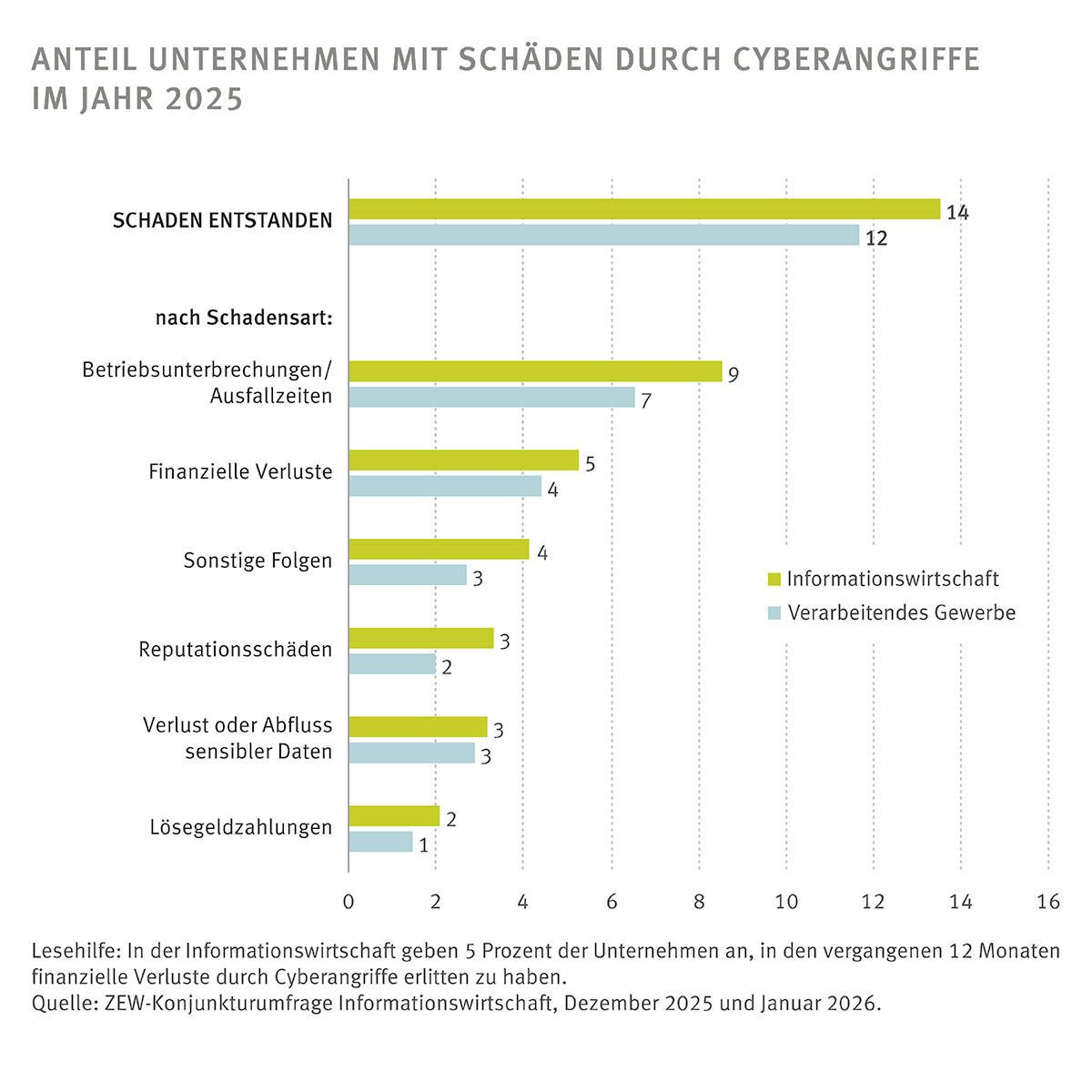 Etwa jedes siebte Unternehmen in der Informationswirtschaft und jedes achte Unternehmen im Verarbeitenden Gewerbe hat im vergangenen Jahr Schäden durch Cyberangriffe erlitten. Das geht aus einer repräsentativen Befragung des ZEW Mannheim hervor, an der sich im Dezember 2025 und Januar 2026 rund 1.100 Unternehmen beteiligten. Die EU-Richtlinie zur Netz- und Informationssicherheit NIS-2 soll zu mehr Cybersicherheit beitragen. Deren Umsetzung wird aber von einem Großteil der von der neuen Regelung betroffenen Unternehmen in Deutschland kritisch bewertet. „Für die Geschäftsabläufe der meisten Unternehmen sind möglichst reibungslos funktionierende IT-Systeme essenziell. Der jüngste Hackerangriff auf die Deutsche Bahn verdeutlicht allerdings, welchen Cyberbedrohungen Unternehmen hierbei täglich ausgesetzt sind“, erklärt Studienleiter Dr. Daniel Erdsiek aus dem ZEW-Forschungsbereich „Digitale Ökonomie“. „In der Informationswirtschaft, die unter anderem IT- Dienstleister umfasst, berichten neun Prozent der Unternehmen, im vergangenen Jahr Ausfallzeiten durch Cyberangriffe erlitten zu haben. Im Verarbeitenden Gewerbe kam es bei sieben Prozent der Unternehmen zu solchen Betriebsunterbrechungen.“