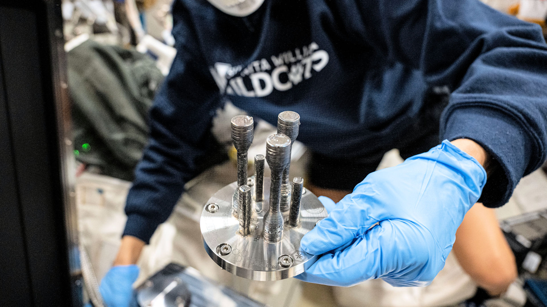 Der Metall-3D-Drucker der ESA hat das erste Metallteil hergestellt, das jemals im Weltraum produziert wurde. Dazu wurde Edelstahl-Draht mit einem Hochleistungslaser geschmolzen um die Drucke zu erstellen. (Quelle: ESA/NASA)